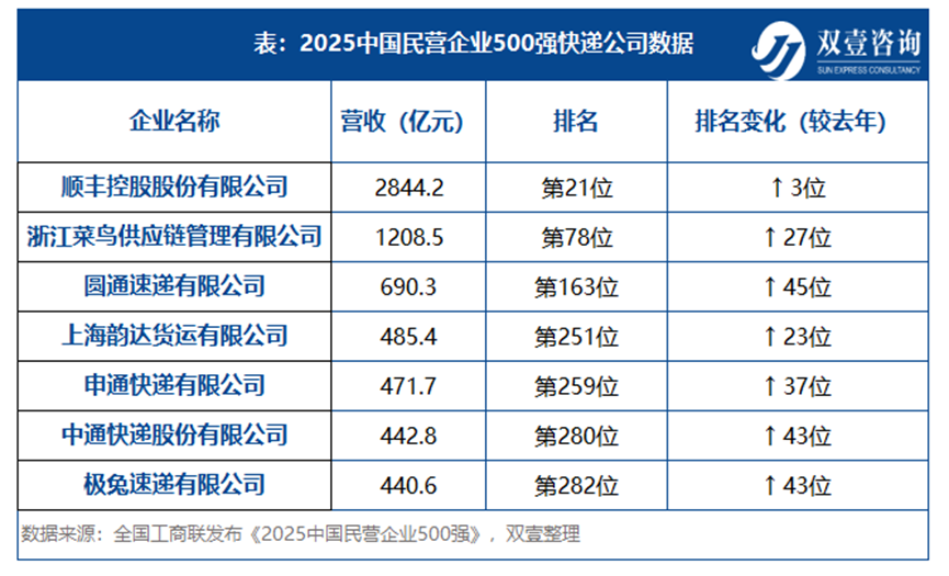 顺丰、菜鸟、圆通、韵达、申通、中通、极兔——七家快递企业悉数入围2025年中国民营企业500强榜单且排名均有提升,这不仅体现了快递物流行业的整体崛起,更揭示了中国经济新动能中数字化、绿色化转型的重要趋势。